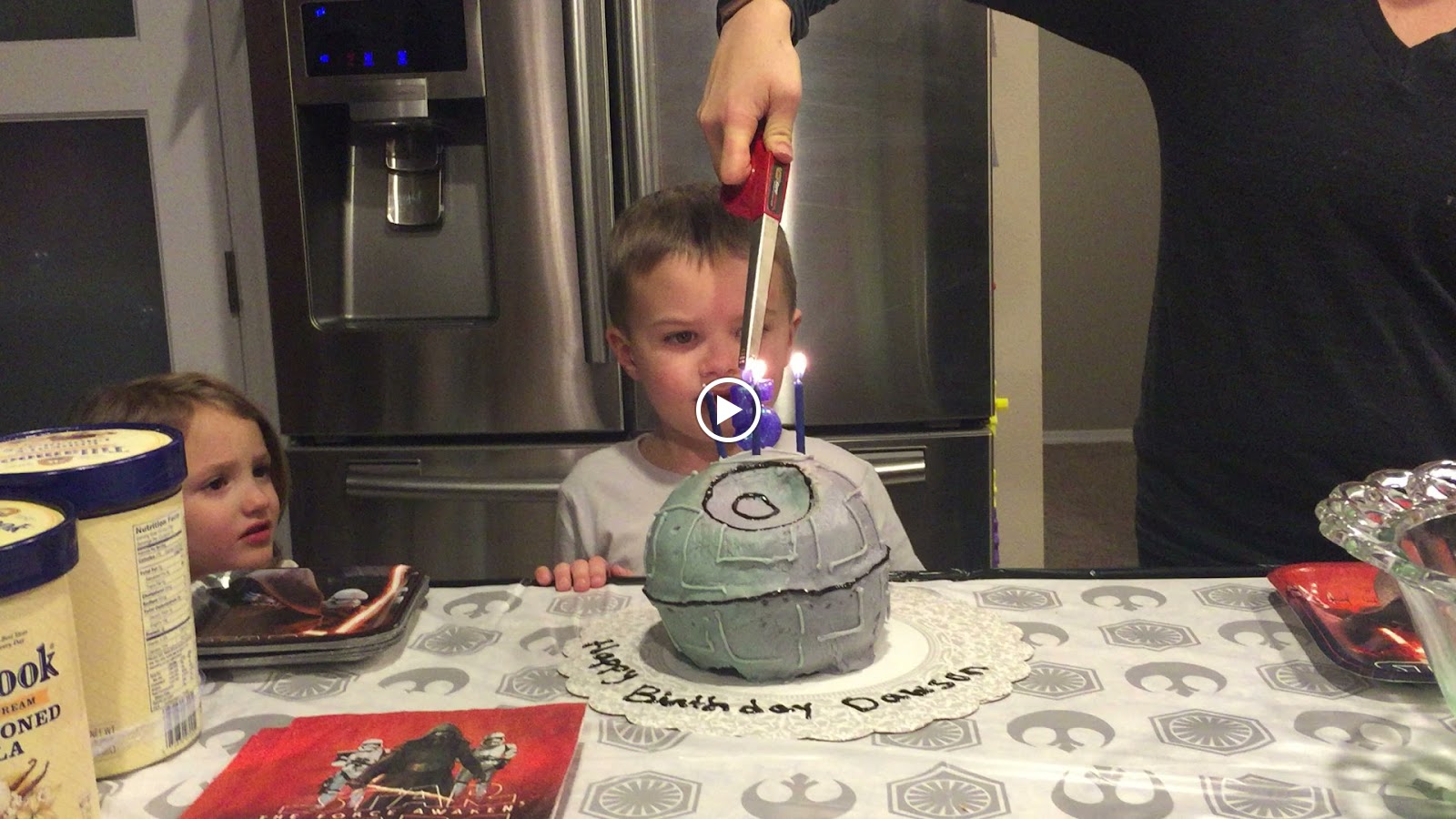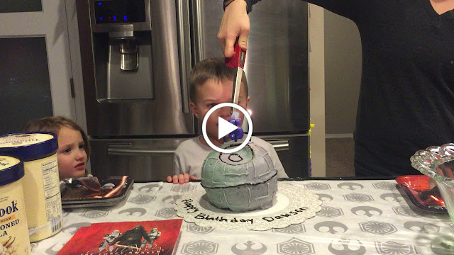 For his birthday this year, we decided to do just a family party. Joey and I have pretty much decided to start the big friend birthday parties when the kids start school. Until then, we will keep it small and family only. I asked him what theme he wanted, and of course he answered immediately with Star Wars. He wanted me to make his cake and I tried my best at making him a Death Star. I have decided my cake making abilities are just get worse over the years, so after that cake I am officially retiring. Despite how awful I thought it turned out, he absolutely loved it. He got to eat pizza and cake with his sisters and cousins. He opened presents and then played with all his new toys. It was a great day for him.